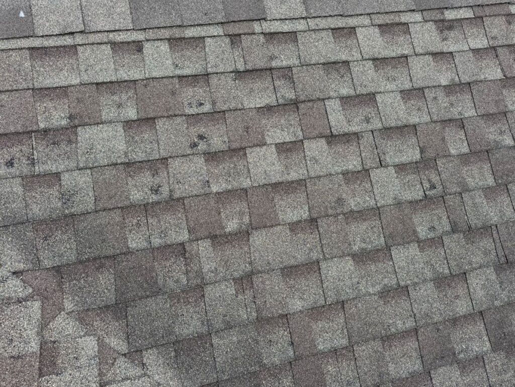 - Granule loss: Bare spots where shingle granules have been displaced.